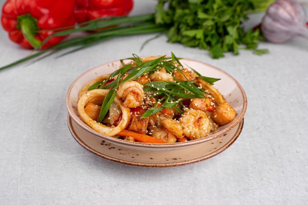 Рис, обжаренный с морепродуктами (креветка, кальмар, филе семги) , болгарским перцем, морковью, пекинской капустой, украшен зеленым луком и кунжутом.