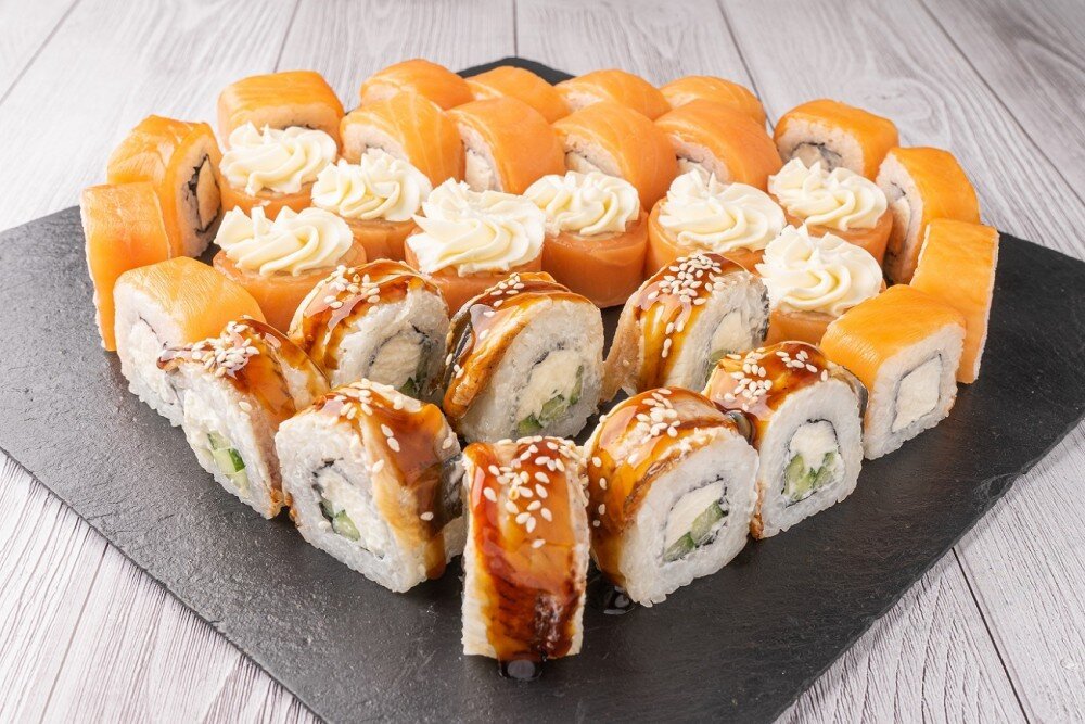 Филадельфия люкс (лосось с/с, сыр сливочный, огурец), филадельфия (лосось с/с, сыр сливочный), филадельфия с луком (лосось с/с, сыр сливочный, лук зеленый), унаги филадельфия (угорь, огурец, сыр сливочный, соус унаги), соевый соус, имбирь, васаби. 32 кусочка.