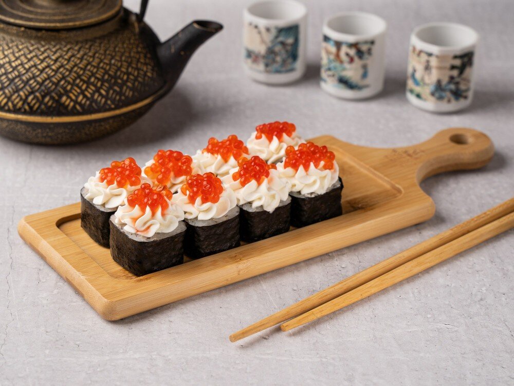 Ролл с лососем с/с, огурцом, сливочным сыром, украшен белковой икрой.