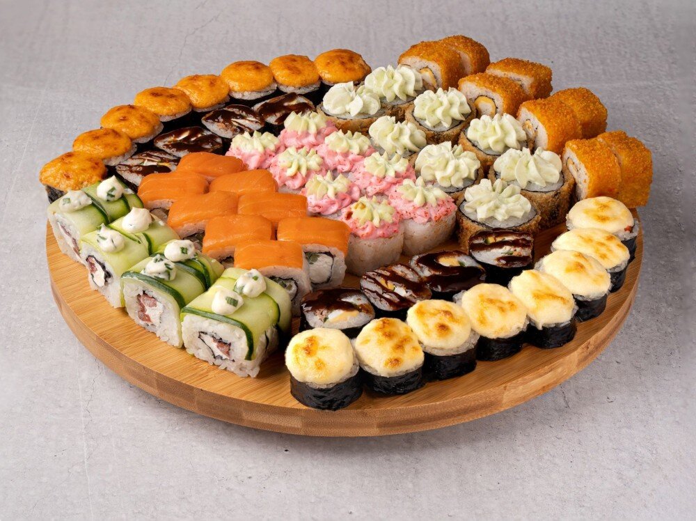 Филадельфия лайт (лосось с/с, сыр сливочный, огурец), бостон (лосось с/с, сыр сливочный, сыр плавленный, огурец, зеленый лук, соус черно-перечный), сиеста (томат, соус лава), свежий (томат, огурец, соус тар-тар), темпура с сыром (сыр плавленный, сыр сливочный, темпура), темпура с крабом (снежный краб, огурец, соус лава, темпура), запеченный с лососем (лосось с/с, огурец, соус Яки), запеченный кальмар (кальмар, соус спайси, болгарский перец, сыр), соевый соус, имбирь, васаби. 64 кусочка.