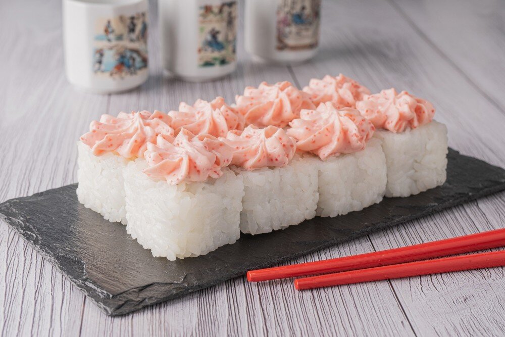 Ролл со слабосоленой семгой, крабовым мясом, украшен соусом лава (С ЧЕСНОКОМ).
