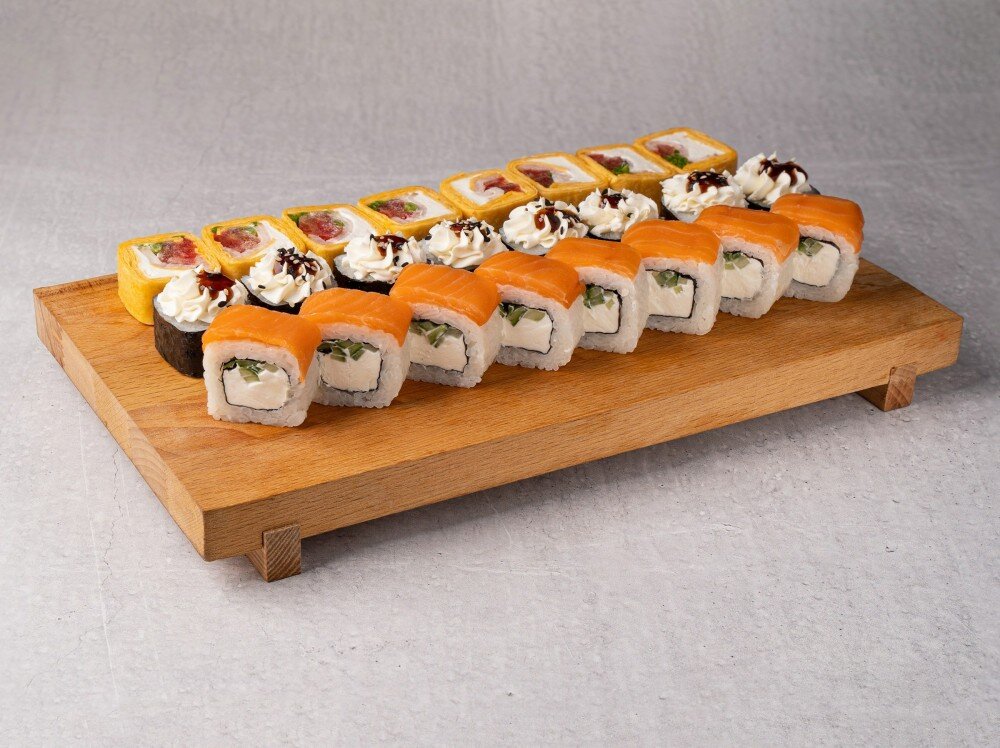 Филадельфия лайт (лосось с/с, сливочный сыр, огурец), Тортилья бекон (бекон, сливочный сыр, томатзеленый лук), Краб терияки (краб, сливочный сыр, соус терияки, огурец), имбирь, васаби. 24 кусочка.