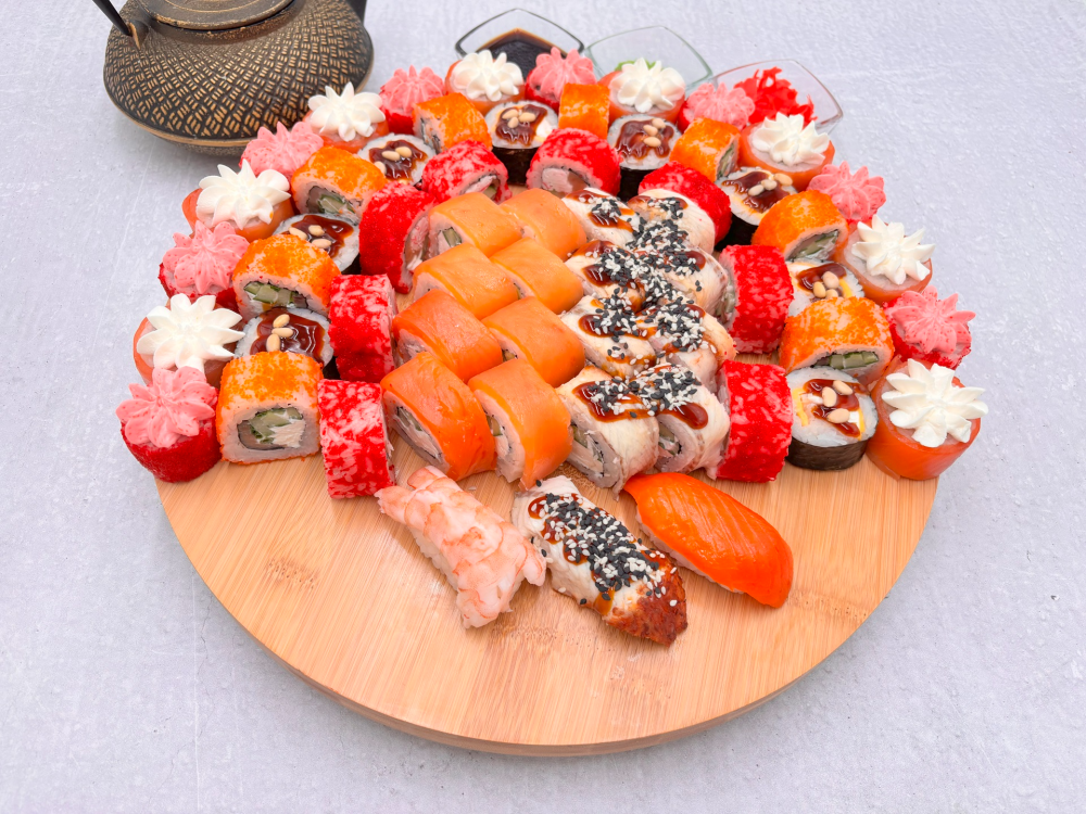 Филадельфия с огурцом (лосось с/с, сыр сливочный, огурец), филадельфия люкс (лосось с/с, сыр сливочный, огурец), флорида (семга х/к, сливочный сыр, огурец, лук зеленый, икра масаго), калифорния (снежный краб, лосось с/с, огурец, майонез, икра масаго), лава люкс (креветка королевская, сыр сливочный, лук зеленый, икра масаго), Филадельфия унаги (угорь, огурец, сыр), ямогути (угорь, сыр плавленный, сыр сливочный, кедровый орех, соус унаги), сяке суши, эби суши, унаги суши, соевый соус, имбирь, васаби. 59 кусочков.