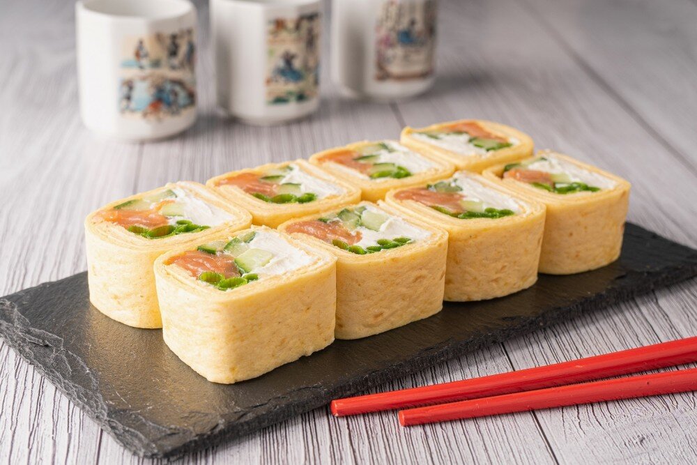 Ролл в пшенично-сырной лепешке со слабосоленым лососем, огурцом, зеленым луком и сливочным сыром.