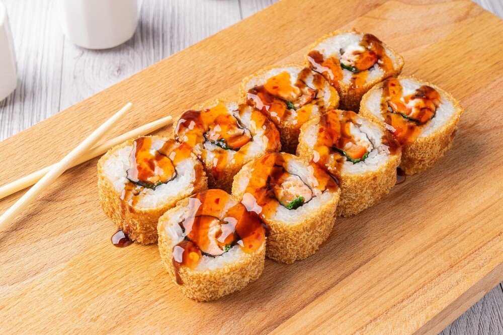Горячий ролл с крабом, копченым лососем, сливочным сыром, зеленым луком, полит соусом сладкий чили.