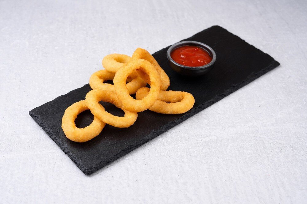 Хрустящие луковые кольца, обжаренные во фритюре.