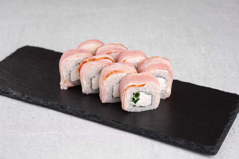 Ролл с беконом, сливочным сыром и зеленым луком.