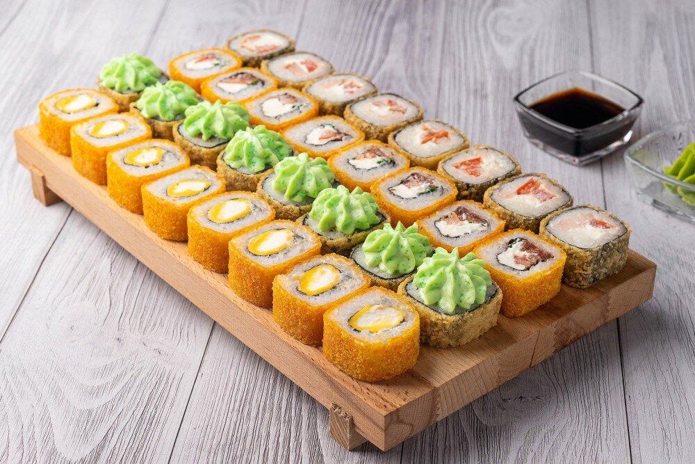 Темпура с сыром (сыр плавленный, сыр сливочный), Темпура с крабом (краб, огурец, соус лава), Темпура с томатом (томар, сливочный сыр, зеленый лук), Темпура чикен (курица в/к, томат, сливочный сыр), имбирь, васаби, соевый соус. 32 кусочка