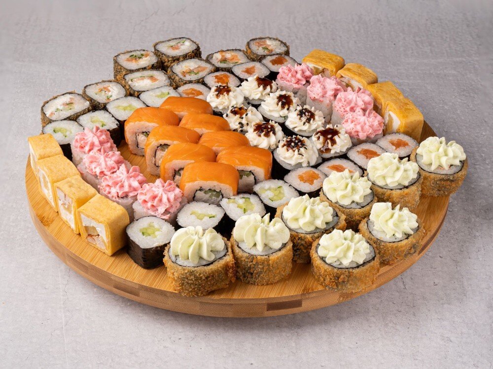 Лава (лосось с/с, краб, соус лава с чесноком), Филадельфия с огурцом (лосось с/с, огурец, сливочный сыр), каппа маки (огурец), Сяке маки (лосось с/с), Краб терияки (краб, огурец, сыр сливочный, соус терияки, кунжут), Тропический (курица в/к, ананас, сыр сливочный), Темпура с крабом (горячий ролл с крабом, соусом лава), темпура сяке (лосось с/с, огурец, сливочный сыр), соус соевый, имбирь, васаби. 64 кусочка