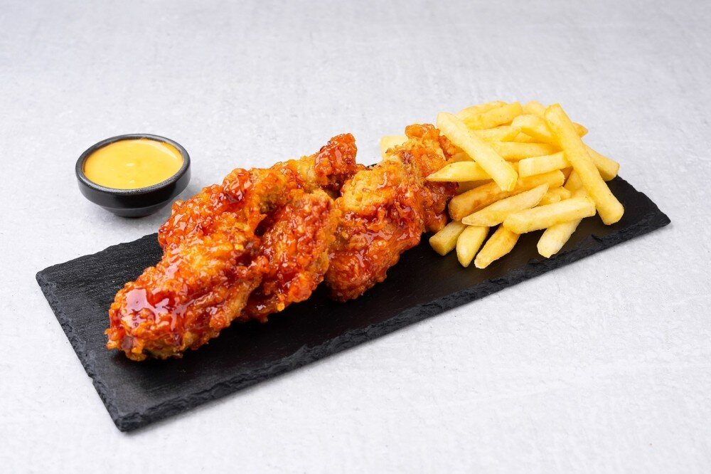 Куриные крылышки, обжаренные во фритюте в острой панирове, глзированные в соусе на выбор. Картофель фри с сырным соусом.