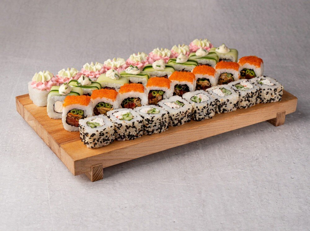 Сиеста (томат, зеленый лук. соус лава), Калифорния в кунжуте (краб, огурец. майонез, кунжут), Свежий (огурец, томат, сыр сливочный, соус тар-тар), Игай (мидии, зеленый лук, сыр сливочный, томат, икра масаго), имбирь, васаби, соус соевый. 32 кусочка.