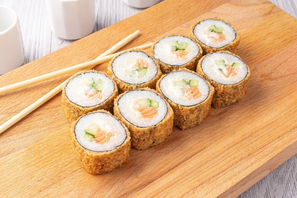Горячий ролл со слабосоленым лососем, огурцом, сливочным сыром.
