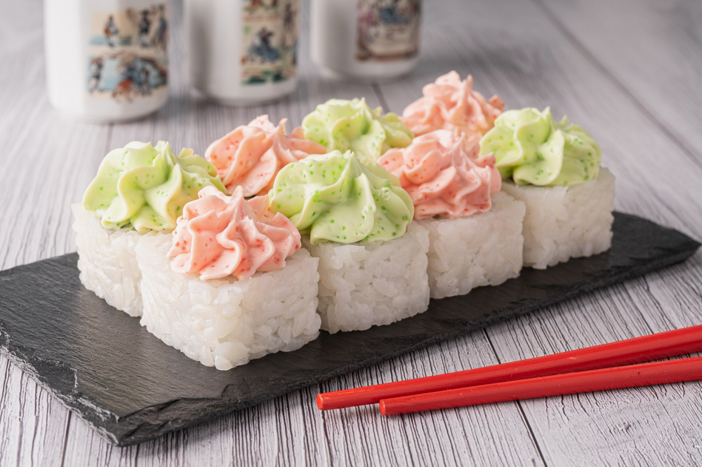 Ролл с курицей в/к, томатом, соусом лава розовый (с чесноком), соусом лава зеленый (без чеснока).