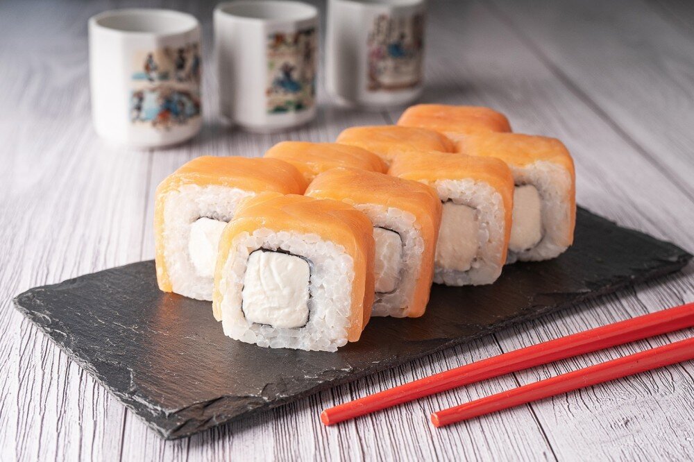 Классический ролл со слабосоленым лососем и сливочным сыром. Вы можете добавить огурец, авокадо или лук на выбор.