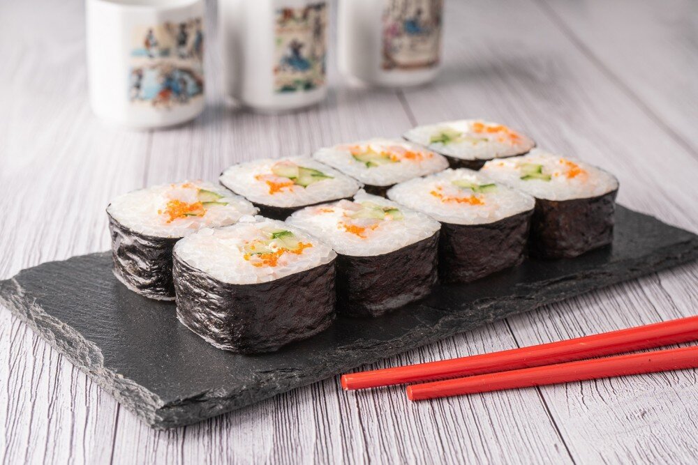 Ролл с королевской креветкой, сливочным сыром и огурцом, икрой масаго