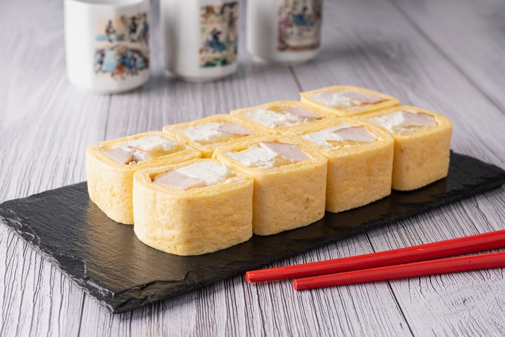 Ролл в пшенично-сырной лепешке с варено-копченой курицей, сливочным сыром и ананасом.