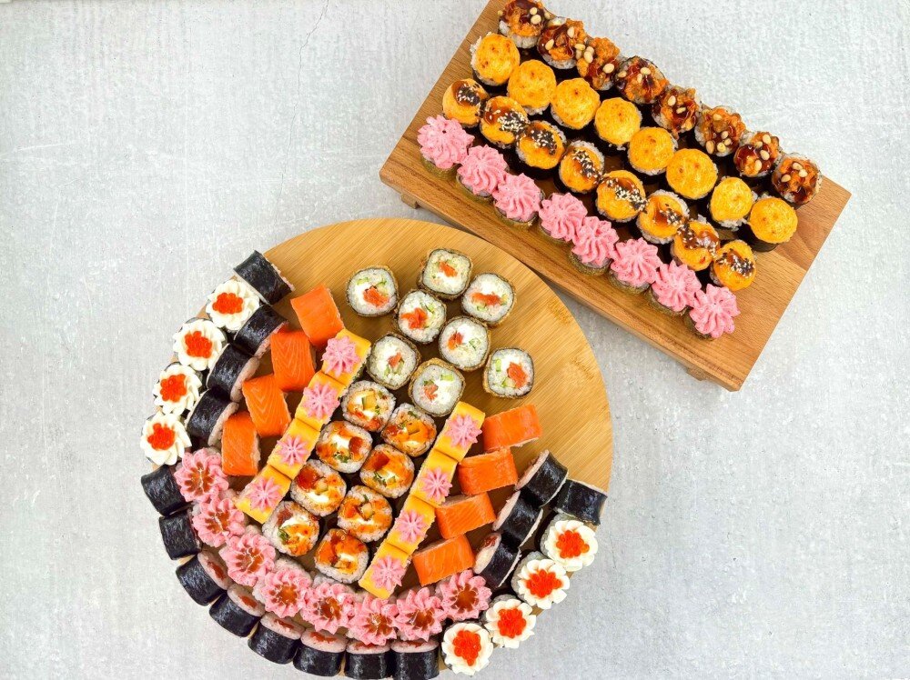 Филадельфия с огурцом (лосось с/с, сыр сливочный, огурец), Сливочный лосось (лосось с/с, сыр сливочный, икра белковая, огурец), Лава с лососем терияки (лосось с/с, огурец, соус лава, соус терияки), Микадо (курица в/к, ананас, сливочный сыр, плавленый сыр, соус лава), Бостон (лосось с/с, сыр сливочный, сыр плавленный, огурец, зеленый лук, соус черно-перечный), Гейша (лосось с/с, огурец, сыр сливочный), Сяке маки (лосось с/с), Темпура сяке (лосось с/с, огурец, сыр сливочный, темпура), Кабуки (лосось с/с, краб, соус лава, темпура), Запеченный с лососем и мидиями (лосось с/с, мидии, зеленый лук, соус яки), Запеченный с лососем (лосось с/с, огурец, соус яки), Запеченный с лососем и угрем (лосось с/с, угорь, огурец, кедровый орех, сосус унаги),соус соевый, имбирь, васаби. 96 кусочков.