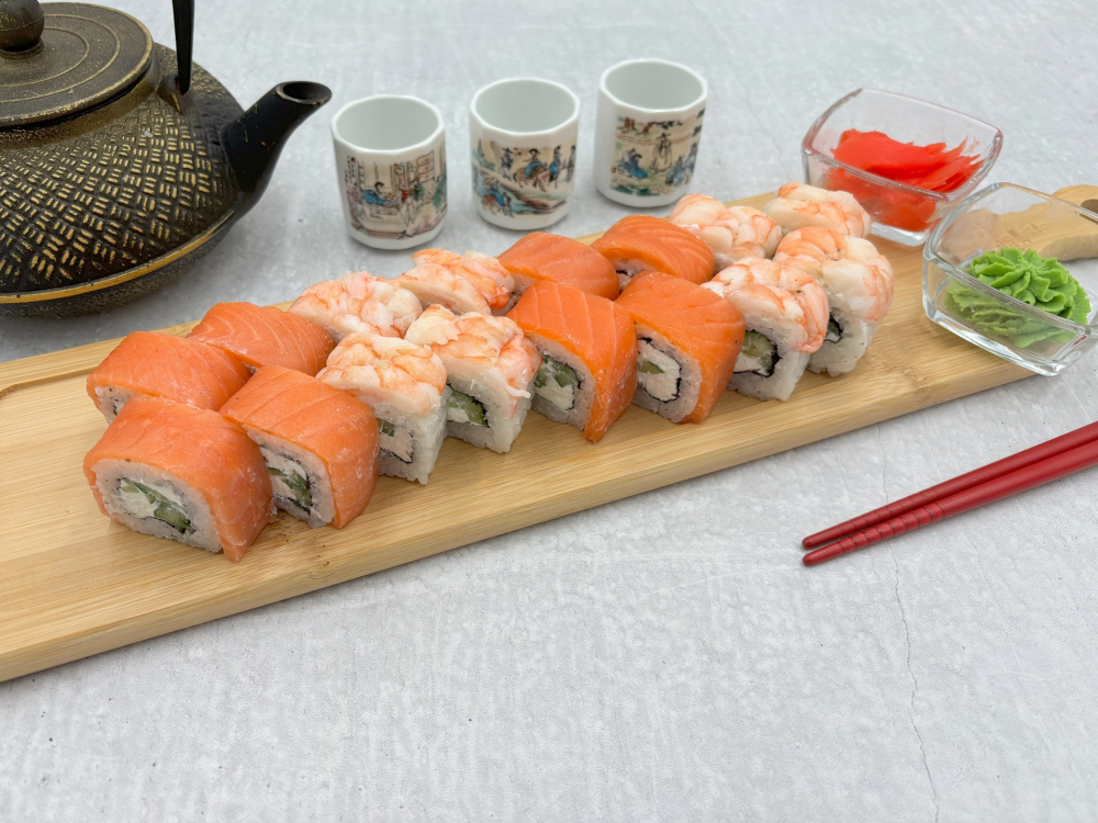 Филадельфия с огурцом (лосось с/с, сыр сливочный, огурец), филадельфия эби (креветка, огурец, сыр сливочный), имбирь, васаби. 16 кусочков