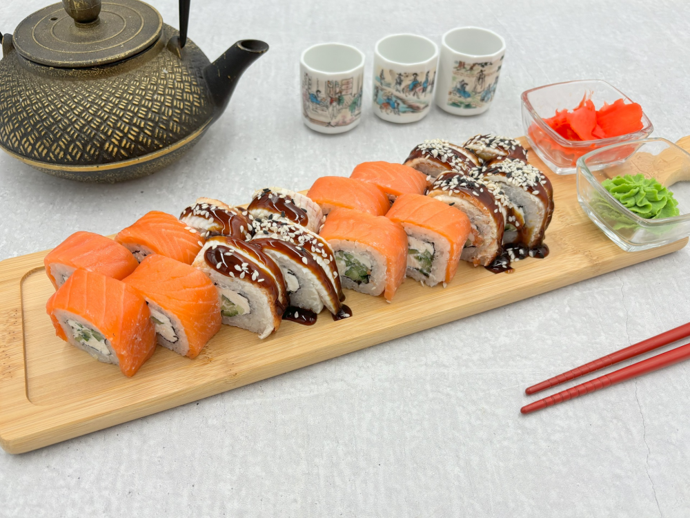 Филадельфия с огурцом (лосось с/с, огурец, сыр сливочный), унаги филадельфия (угорь, сыр сливочный, огурец, соус унаги, кунжут), имбирь, васаби. 16 кусочков.
