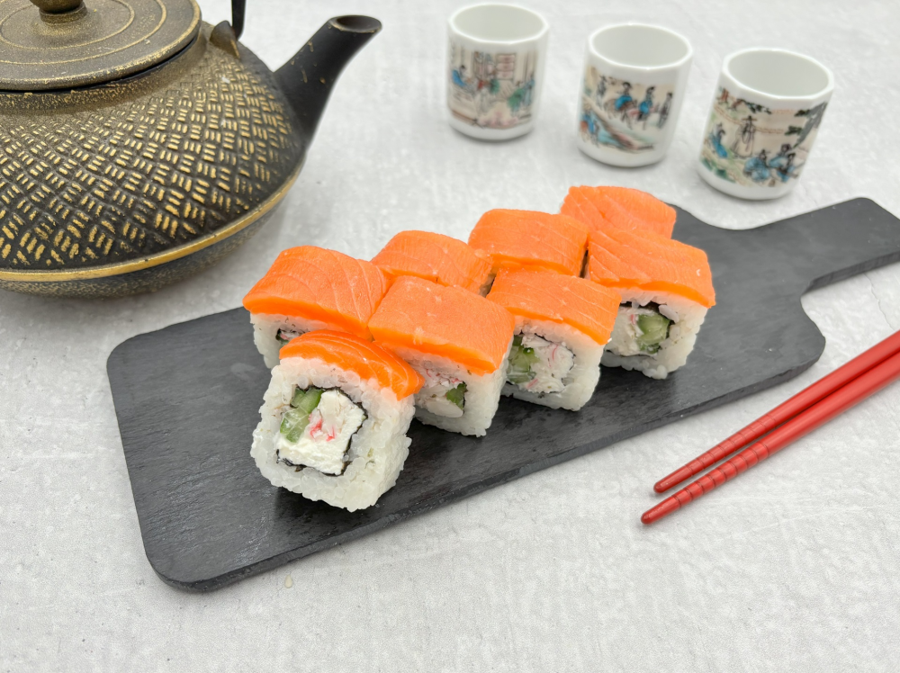 Ролл с лососем с/с, крабом (имитация), огурцом, икрой, майонезом и сливочным сыром