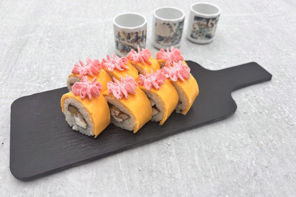 Ролл с копченой курицей, ананасом, плавленным и сливочным сыром, украшен соусом лава с чесноком