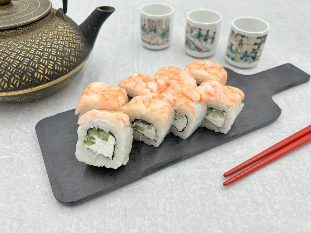 Ролл с креветкой, сливочным сыром и огурцом.