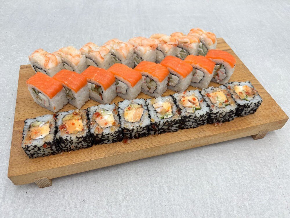 Чикен ролл (курица, сыр сливочный, огурец, соус сладкий чили), филадельфия эби (креветка, огурец, сыр сливочный), сайори (лосось с/с, краб (сурими), огурец, сыр сливочный), имбирь, васаби. 24 кусочка.