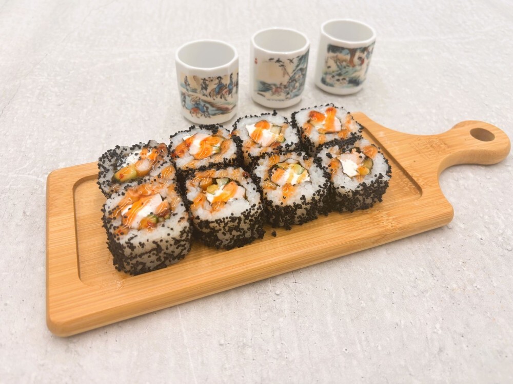 Ролл с копченой курицей, сливочным сыром, огурцом, украшен икрой масаго и соусом чили.