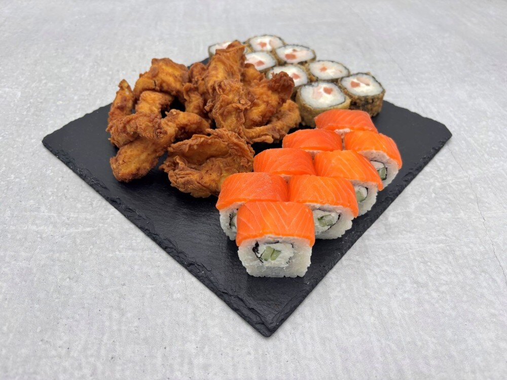 Филадельфия лайт (лосось с/с, сливочный сыр, огурец), Темпура чикен (курица в/к, томат, сыр слив., темпура), Стрипсы куриные оригинальные, имбирь, васаби. 24 кусочка.