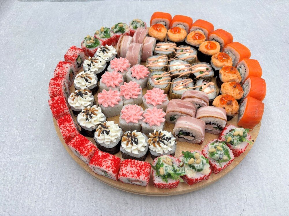 Калифорния (краб (сурими), огурец, майонез, икра масаго имит.), Токати (водоросли чука, сыр сливочный, икра имит, орех кедр.), Лава (краб (сурими), лосось с/с, соус "лава" с чесноком), Краб терияки (краб (сурими), сыр слив., огурец, кунжут), Филадельфия с огурцом (лосось с/с, сыр слив., огурец), Бекон ролл (бекон, лук зел., сыр слив.), Темпура бекон (бекон, лук зел., сыр слив, темпура), Запеченный с курицей (курица в/к, томат, фирменный соус), соевый соус, имбирь, васаби. 64 кусочка.