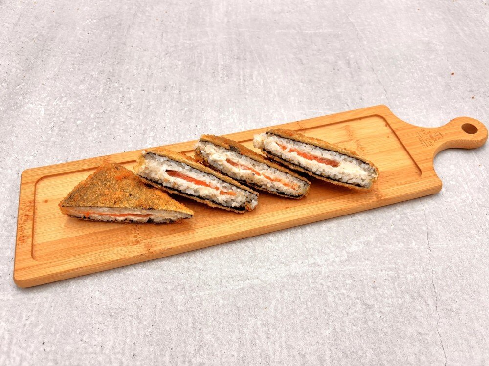 Хрустящий, острый, теплый сендвич с обжаренным беконом, томатом, зеленым луком, сливочным сыром. Более удобная и сытная форма ролла, в нашем сендвиче много начинки и совсем не много риса, если ты голоден и у тебя мало времени - это то что нужно!
