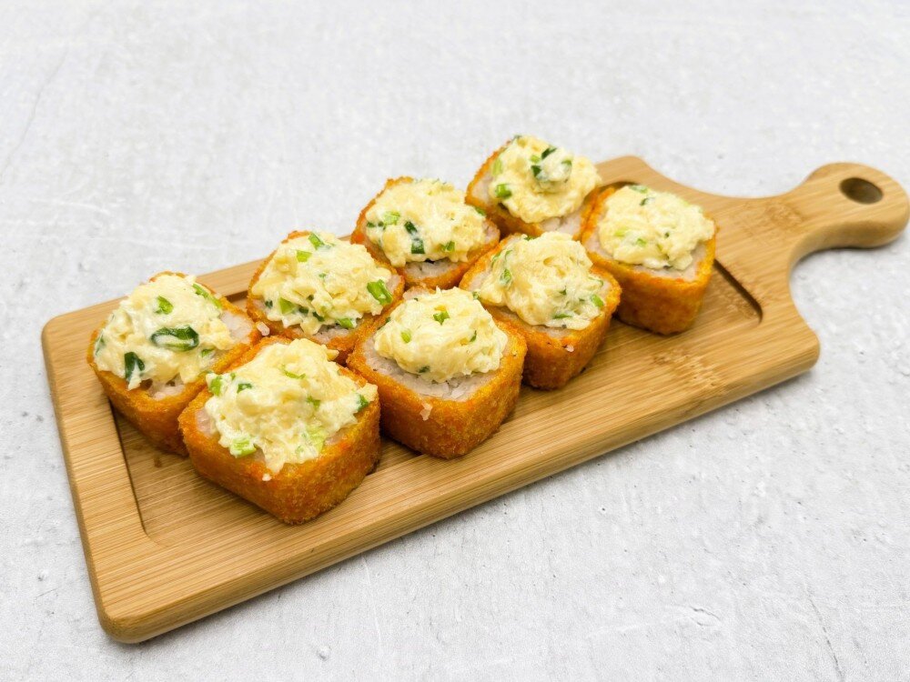 Хрустящий теплый ролл с курицей в/к фирменным соусом (тертый сыр, зеленый лук, майонез) и томатом.